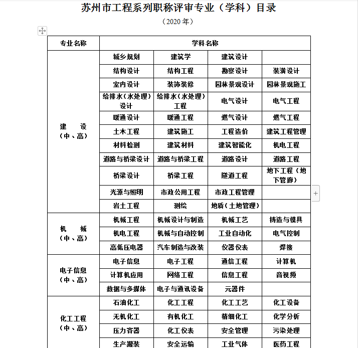 2020年蘇州工程系列職稱評審專業(yè)(學(xué)科)目錄